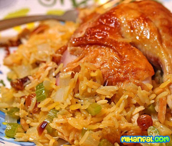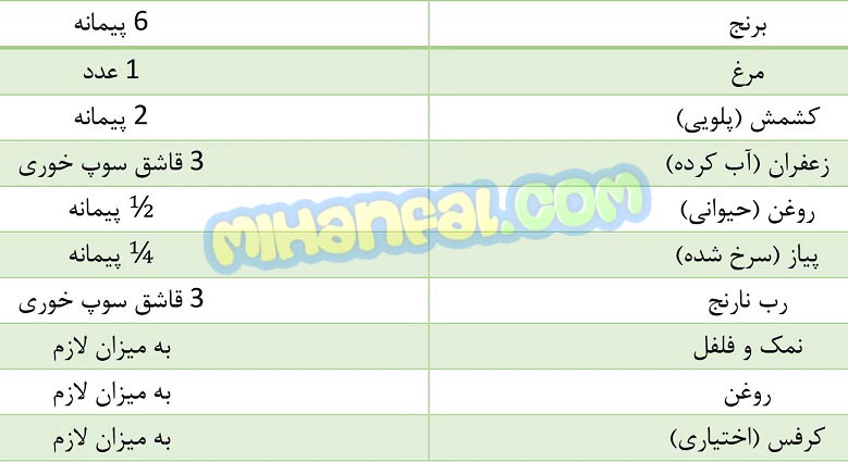 ۵- در ظرف سرو ابتدا پلوی ساده را کشیده، تکه های مرغ را بر روی آن قرار داده و مخلوط کشمش و برنج را روی آن می دهیم و سرو می نماییم.