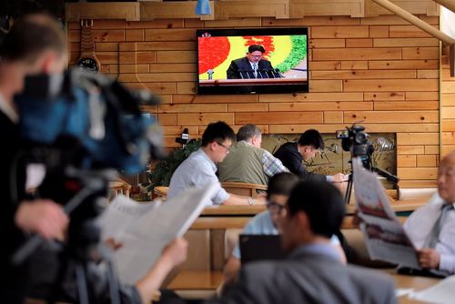 خبرنگاران خارجی که برای پوشش اخبار کنگره سراسری حزب حاکم کره شمالی به پیونگ یانگ رفته اند در هتل محل اقامت خود در حال پوشش اخبار کنگره هستند