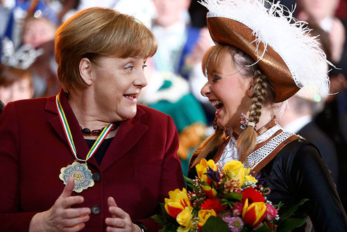 آنگلا مرکل صدر اعظم آلمان در حال نگاه به آینه در یک جشنواره – برلین