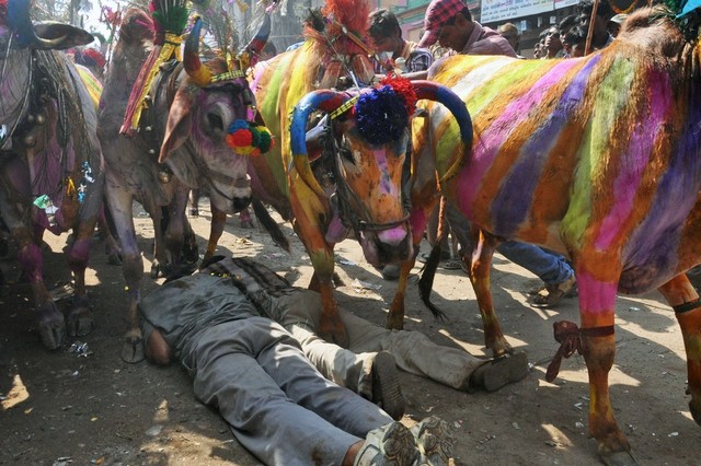 خوابیدن در مسیر حرکت گاوها برای گرامی داشت سال نو هندی (روستایی در هند)