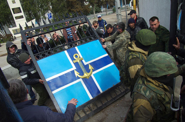 نیروهای هوادار روسیه در حال در آوردن دروازه مقر فرماندهی نیروهای اوکراین در بندر سواستوپول کریمه