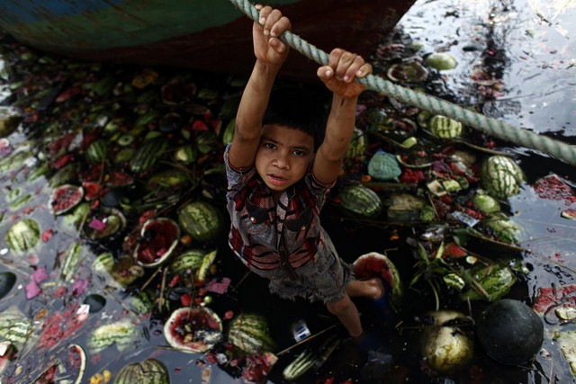 کودک بنگلادشی در جستجوی هندوانه های دور ریخته برای خوردن در رودخانه بوریگانگا شهر داکا