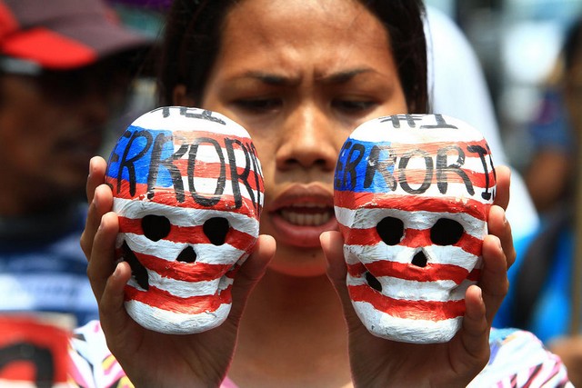 تظاهرات علیه حضور نظامیان آمریکایی در فیلیپین در مقابل ساختمان سفارت آمریکا در شهر مانیل