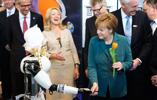 یک روبات در حال گل دادن به آنگلا مرکل صدر اعظم آلمان در نمایشگاه سالانه تجارت و صنعت در هانوفر آلمان