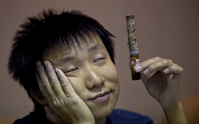 یک شرکت کننده در مسابقه بیشترین خاکستر نریخته سیگار برگ کوبایی در شهر هاوانا کوبا