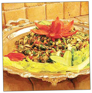 ابتدا قارچ و پیازچه را خرد کرده و با ذرت، نخودفرنگی و جعفری مخلوط میکنیم. سپس به آن کمی روغن زیتون، نمک و فلفل اضافه کرده و با گوجهفرنگی، خیار و ساقه کرفس تزیین میکنیم.